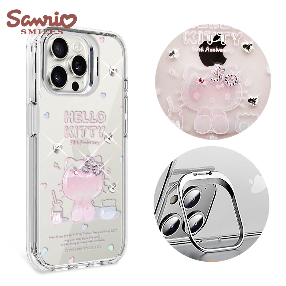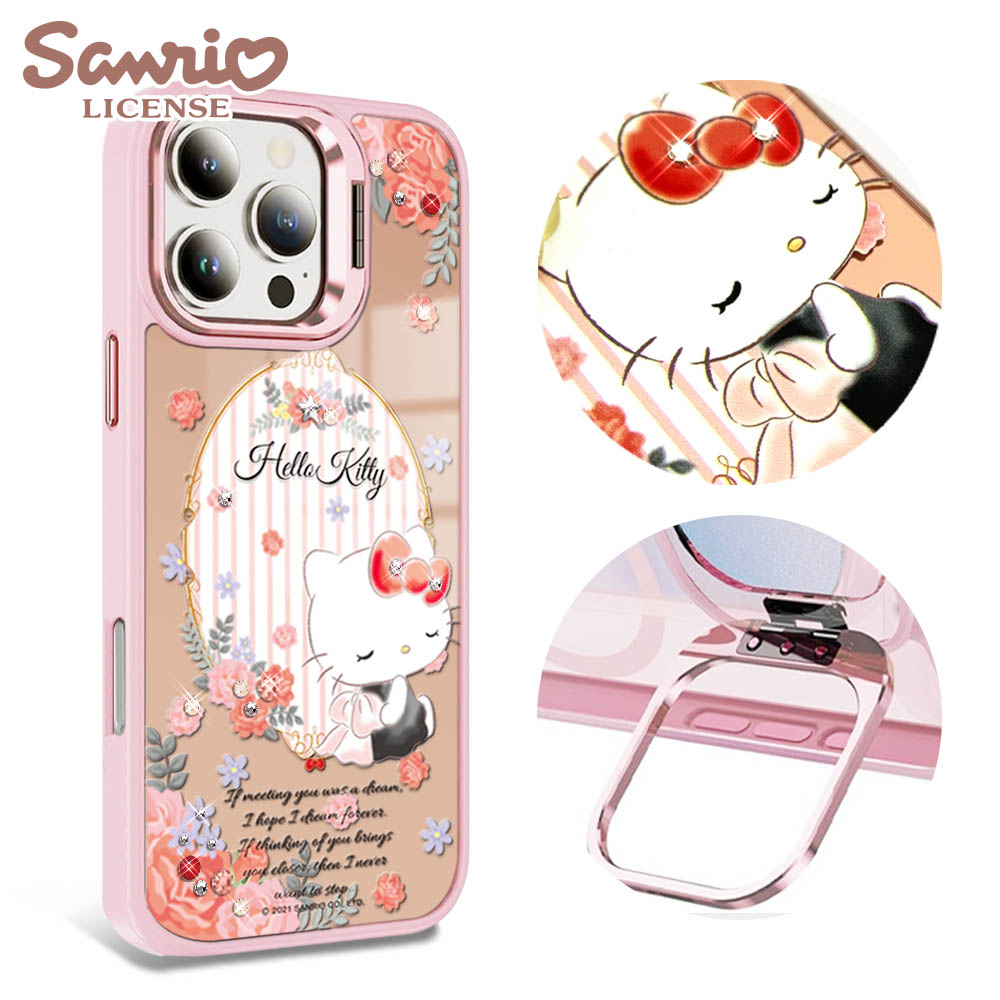 三麗鷗 軍規防摔合金框隱形立架鏡面彩鑽手機殼-浪漫凱蒂-粉框(iPhone 17/16/15/14/13系列)