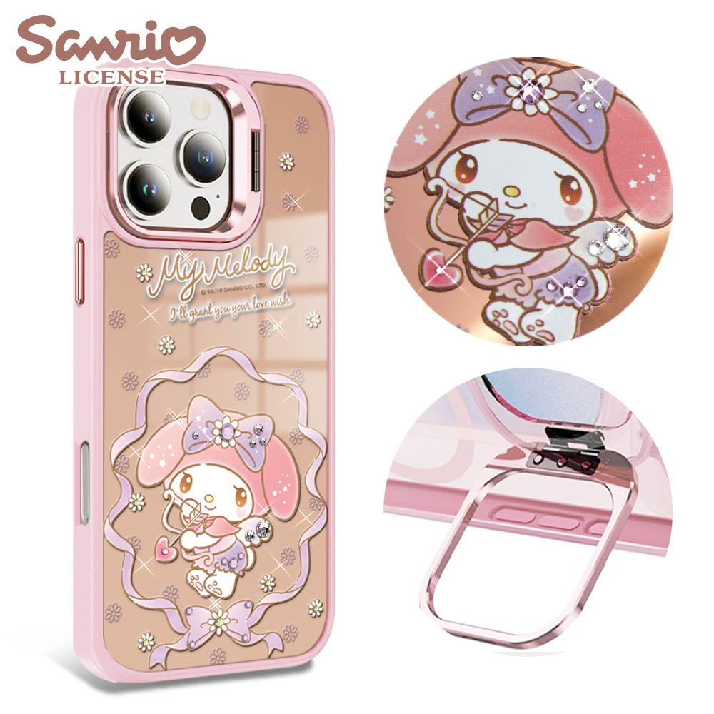 三麗鷗 軍規防摔合金框隱形立架鏡面彩鑽手機殼-美樂蒂邱比特-粉框(iPhone 17/16/15/14/13系列)