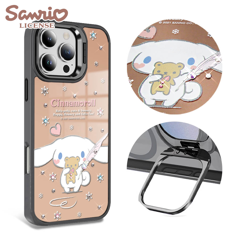 三麗鷗 軍規防摔合金框隱形立架鏡面彩鑽手機殼-雪花大耳狗-黑框(iPhone 17/16/15/14/13系列)