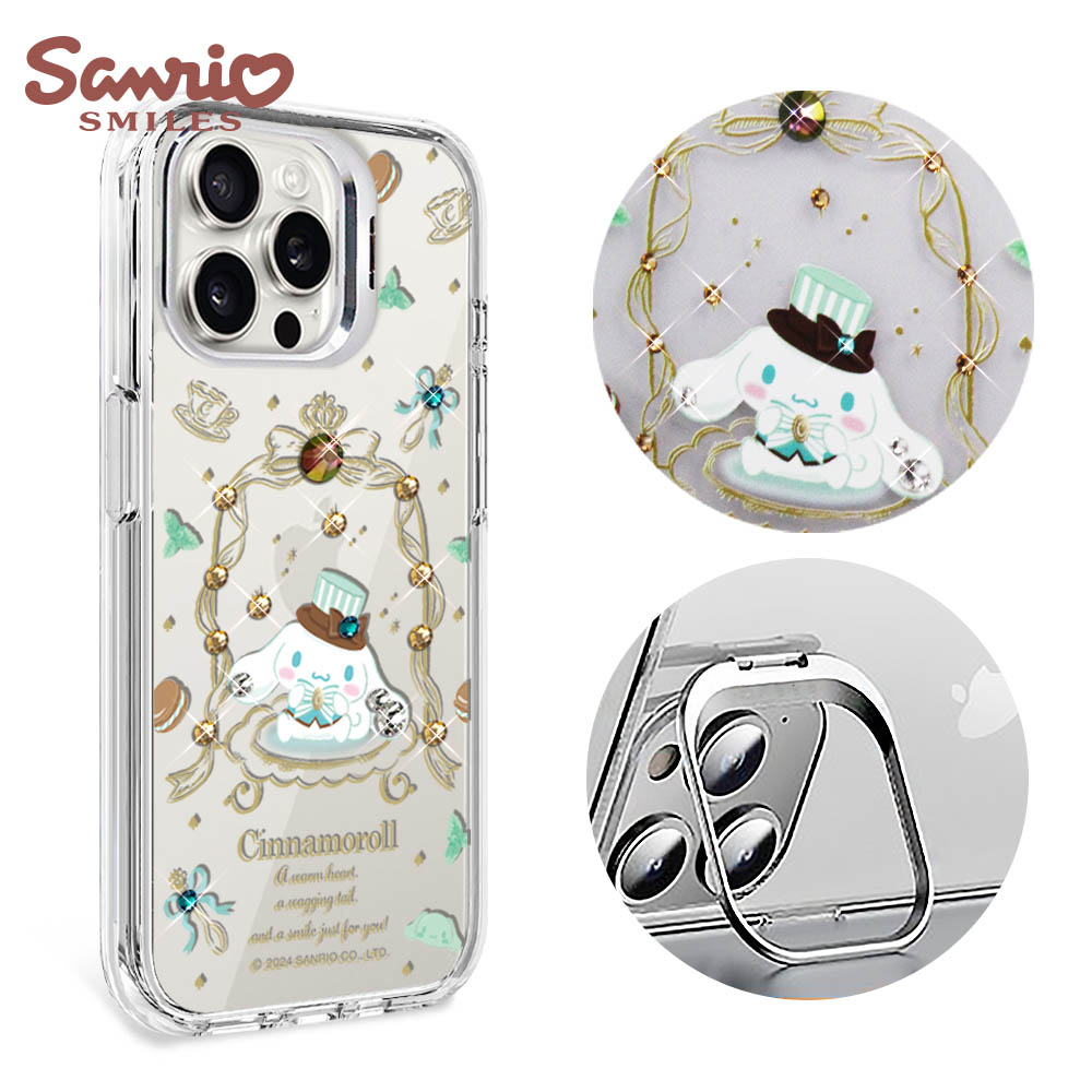 三麗鷗 軍規防摔合金框隱形立架鏡面彩鑽手機殼-大耳狗邱比特-黑框(iPhone 17/16/15/14/13系列)