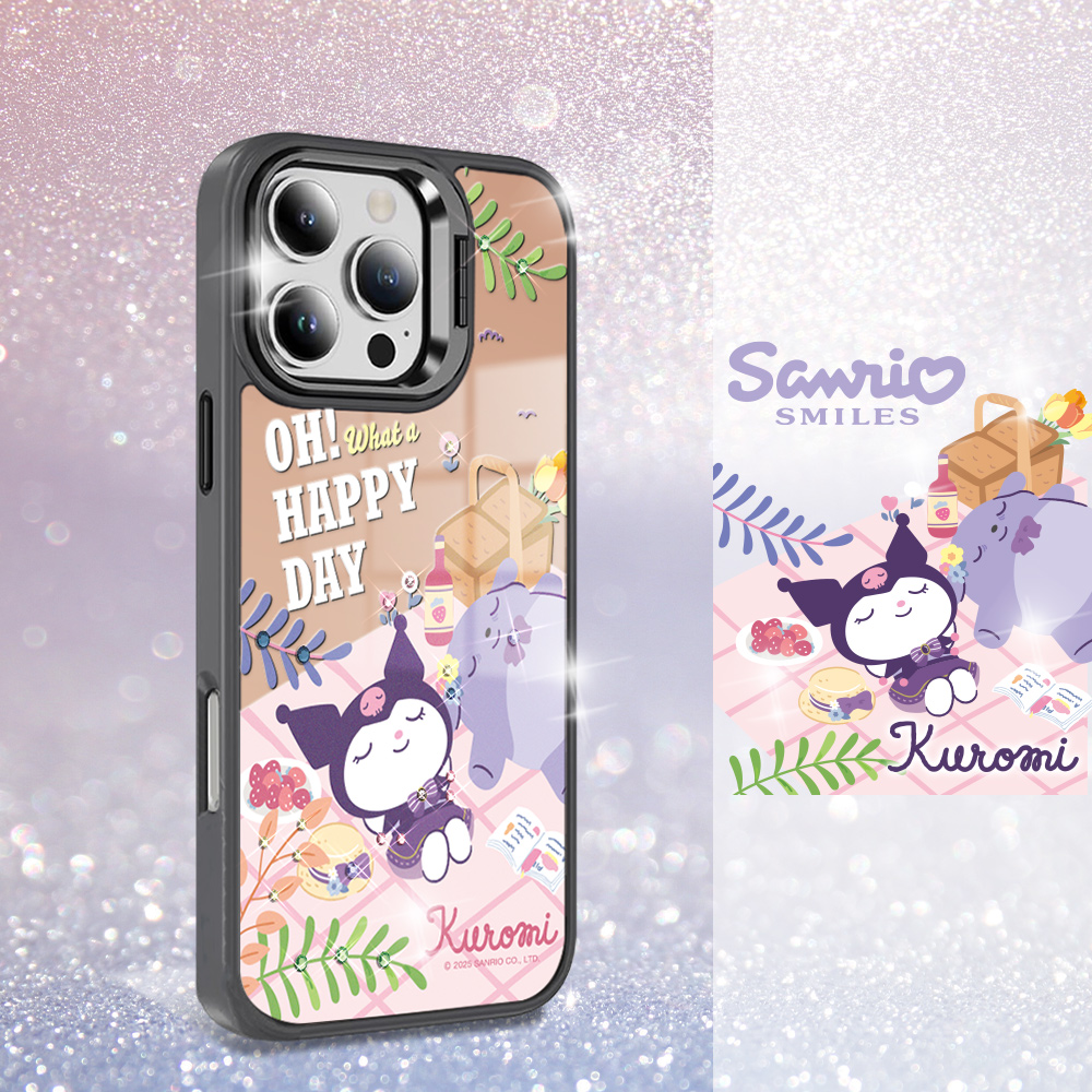 > 商品專區 > 三麗鷗 > 合金框隱形立架彩鑽鏡面 > 三麗鷗 軍規防摔合金框隱形立架鏡面彩鑽手機殼-野餐酷洛米B-黑框(iPhone 17/16/15/14/13系列)