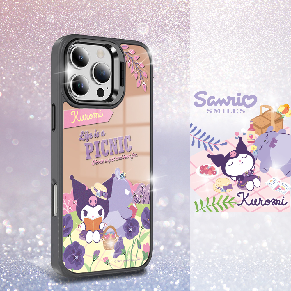 > 商品專區 > 三麗鷗 > 合金框隱形立架彩鑽鏡面 > 三麗鷗 軍規防摔合金框隱形立架鏡面彩鑽手機殼-野餐酷洛米C-黑框(iPhone 17/16/15/14/13系列)