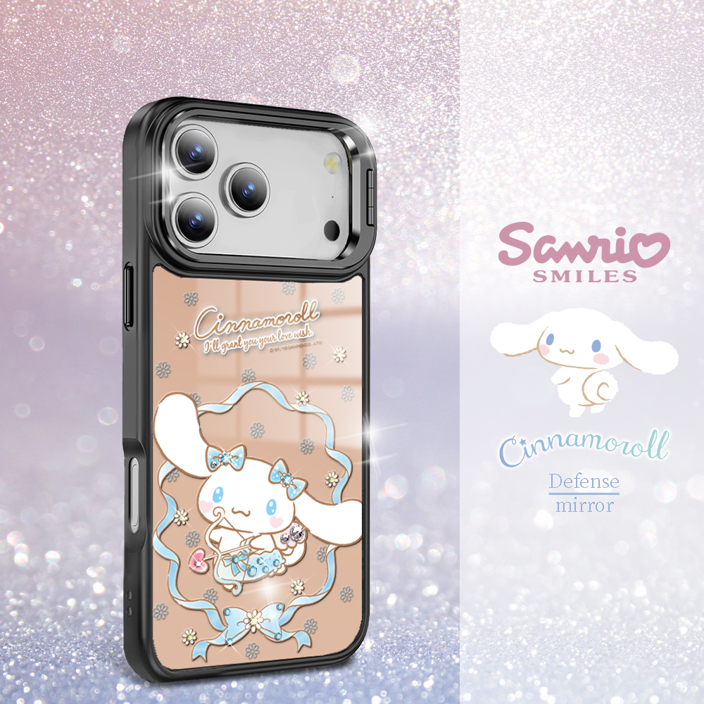 三麗鷗 軍規防摔合金框隱形立架鏡面彩鑽手機殼-大耳狗邱比特-黑框(iPhone 17/16/15/14/13系列)