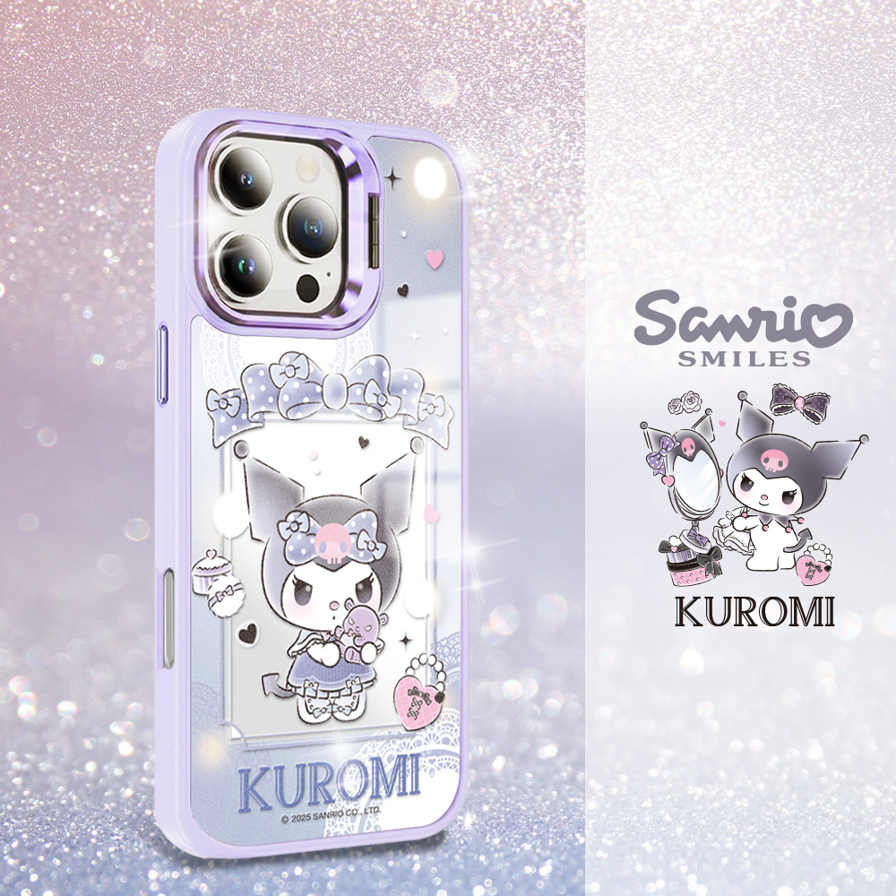 三麗鷗 軍規防摔合金框隱形立架鏡面磁吸手機殼-蕾絲庫洛米C-紫框(iPhone 17/16/15/14/13系列)
