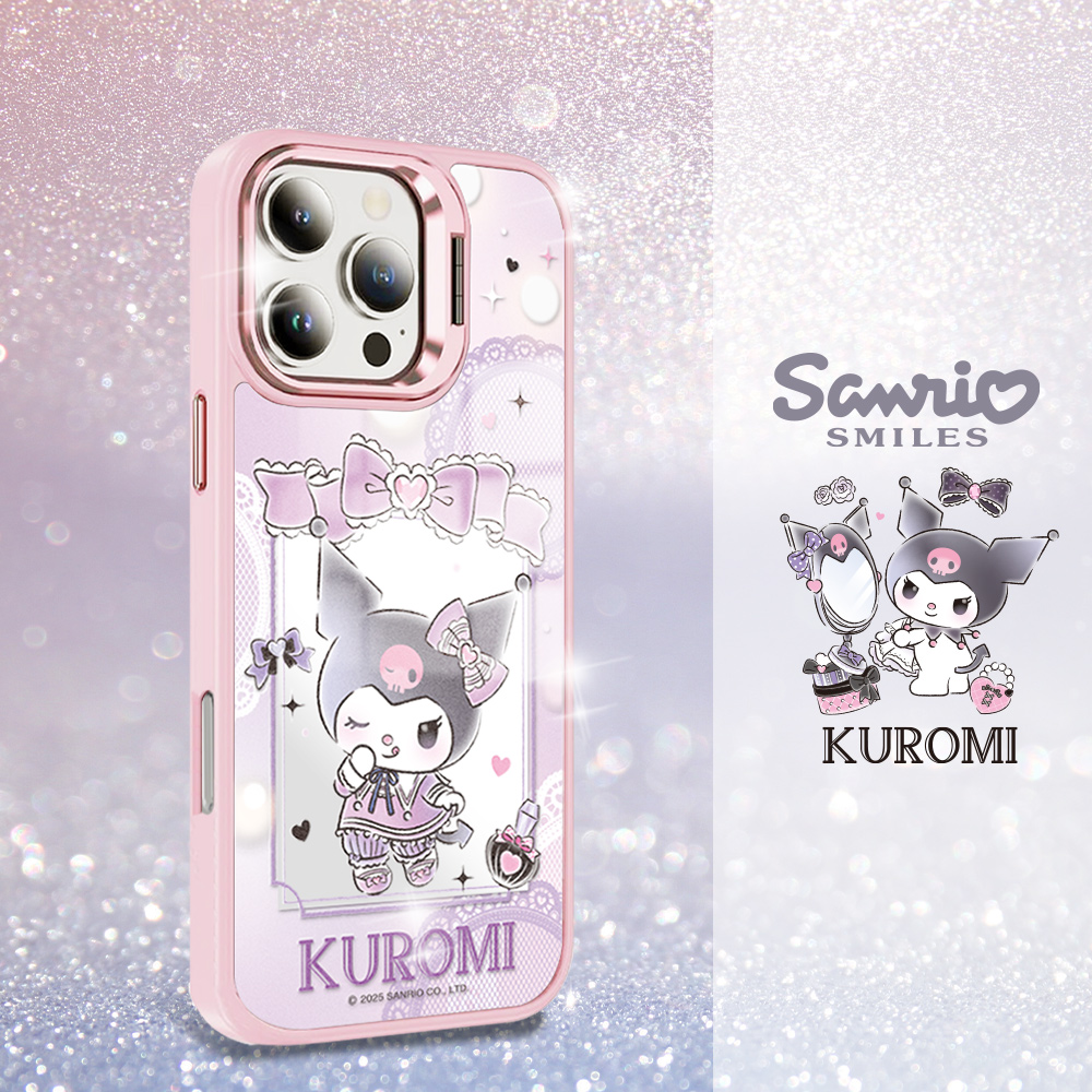 三麗鷗 軍規防摔合金框隱形立架鏡面磁吸手機殼-蕾絲庫洛米C-紫框(iPhone 17/16/15/14/13系列)