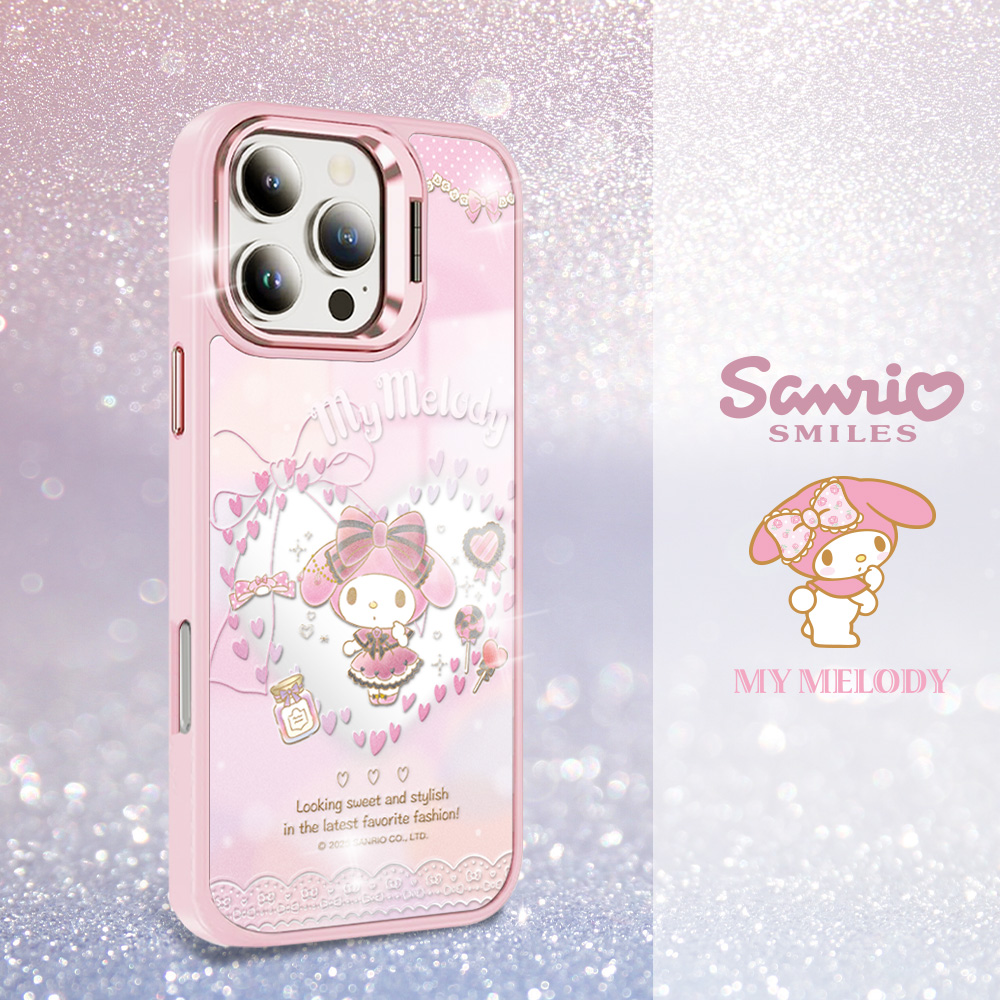 三麗鷗 軍規防摔合金框隱形立架鏡面彩鑽手機殼-美妝美樂蒂-粉框(iPhone 17/16/15/14/13系列)