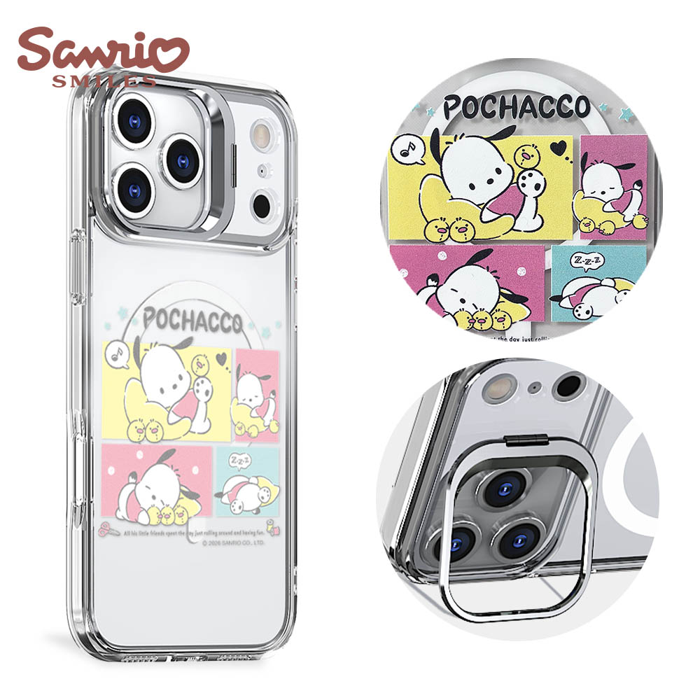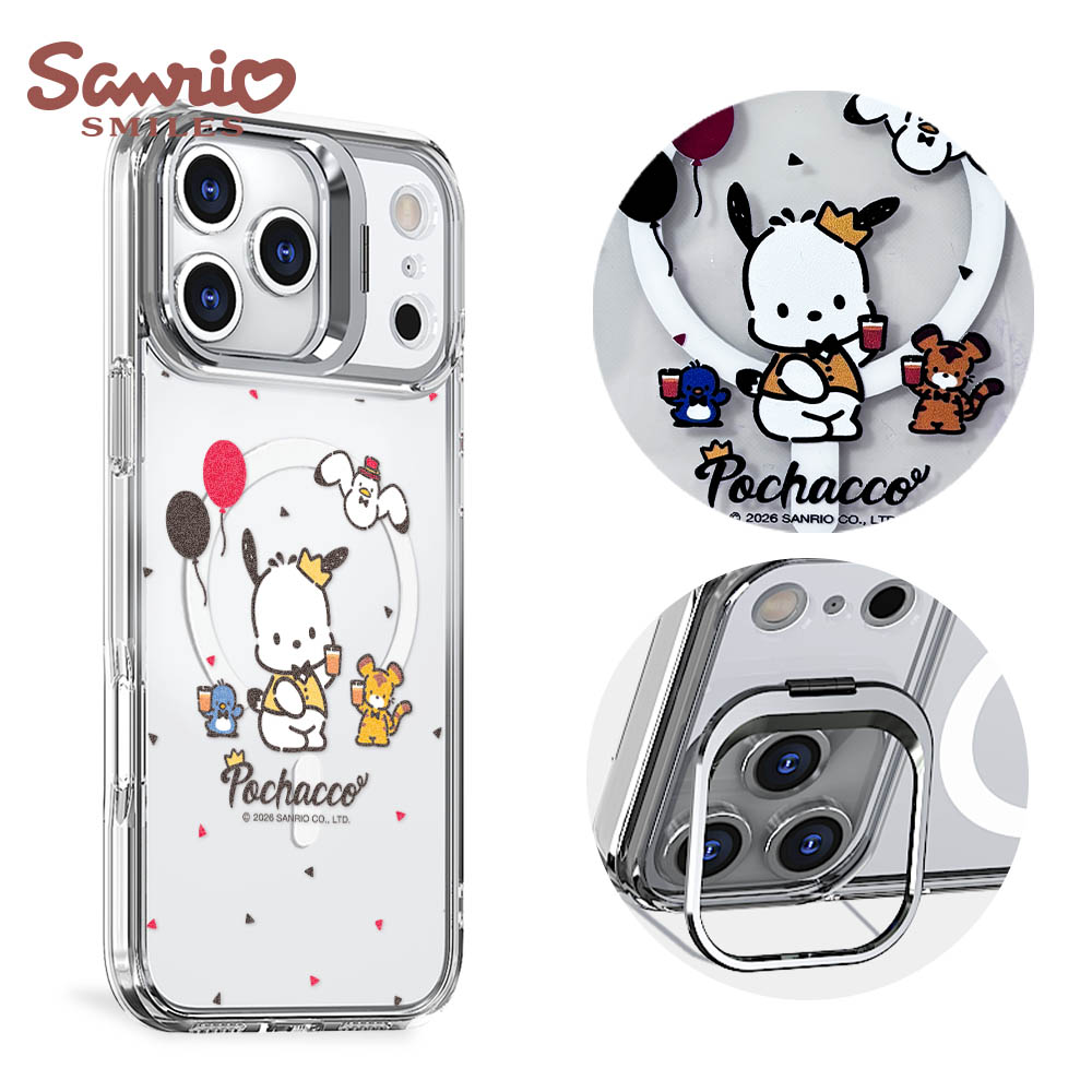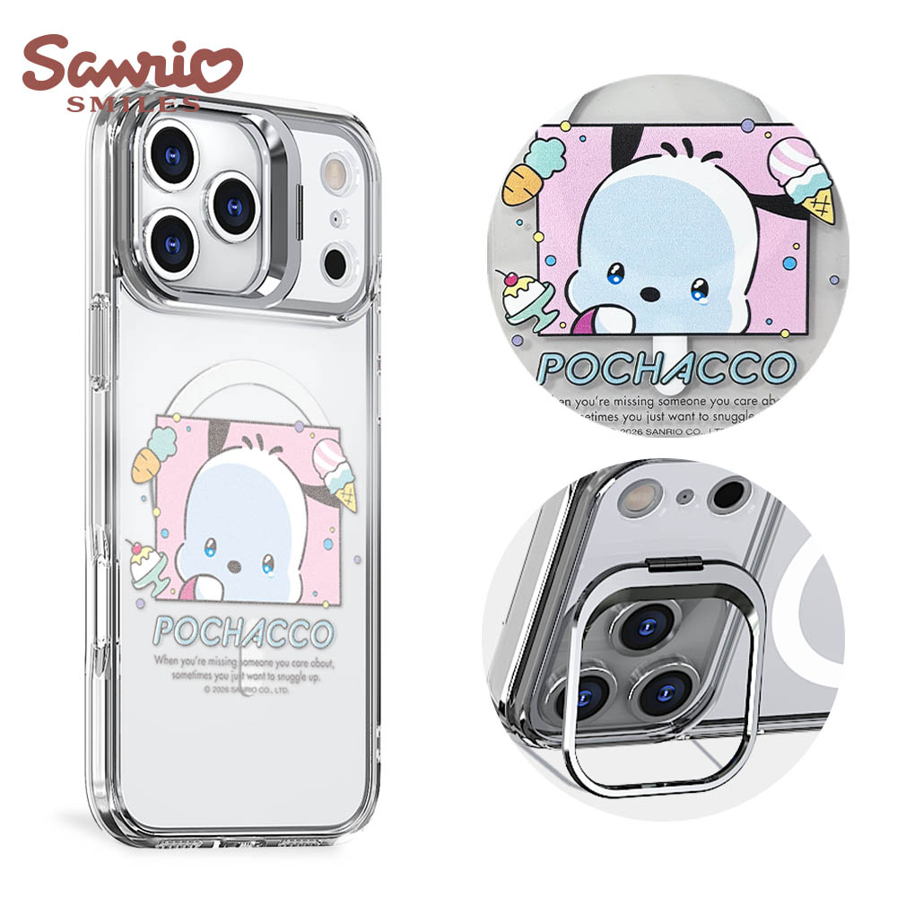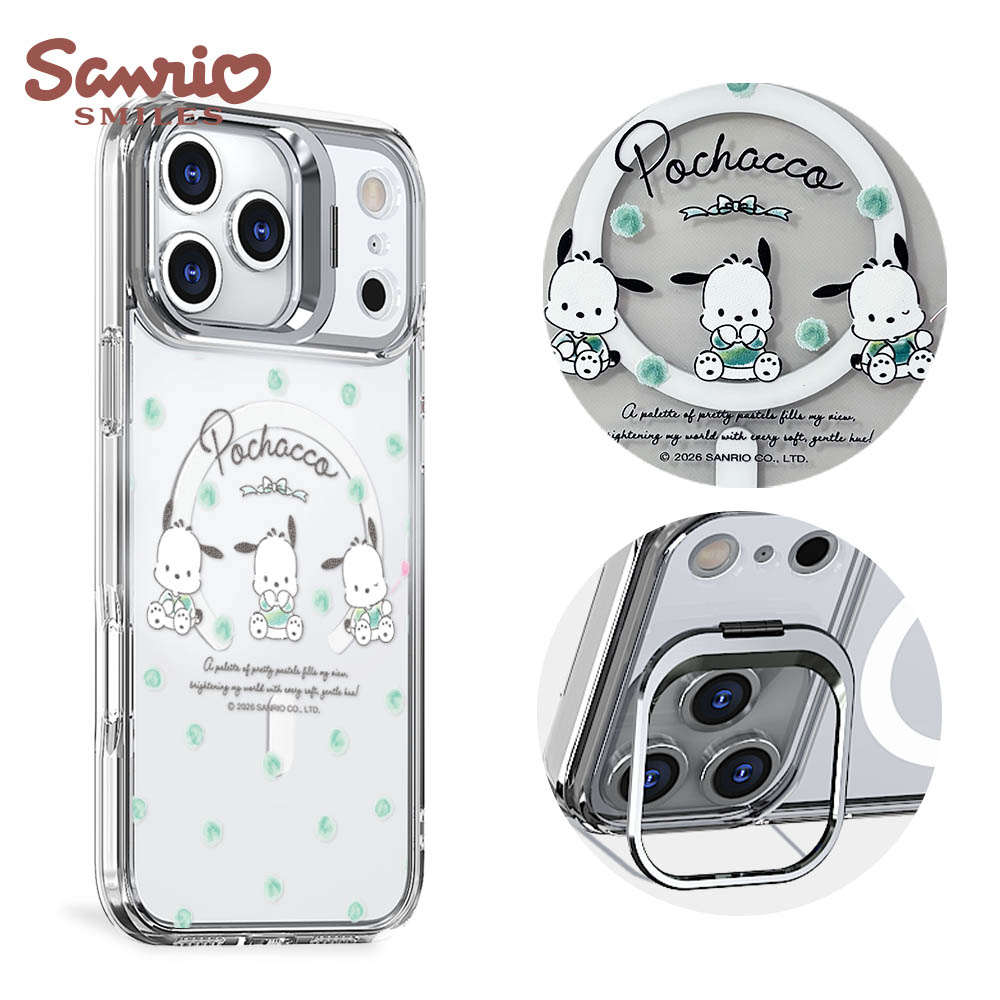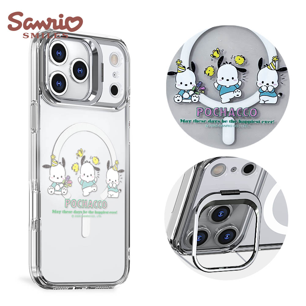 三麗鷗 軍規防摔合金框隱形立架鏡面磁吸手機殼-甜心帕恰狗-黑框(iPhone 17/16/15/14/13系列)