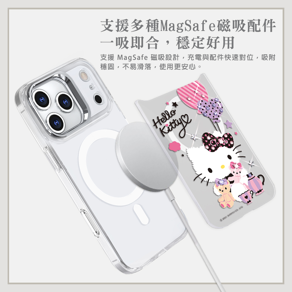 三麗鷗 軍規防摔合金框隱形立架鏡面磁吸手機殼-甜心凱蒂-黑框(iPhone 17/16/15/14/13系列)