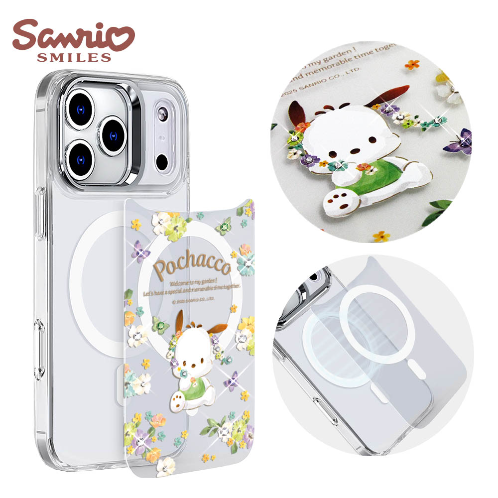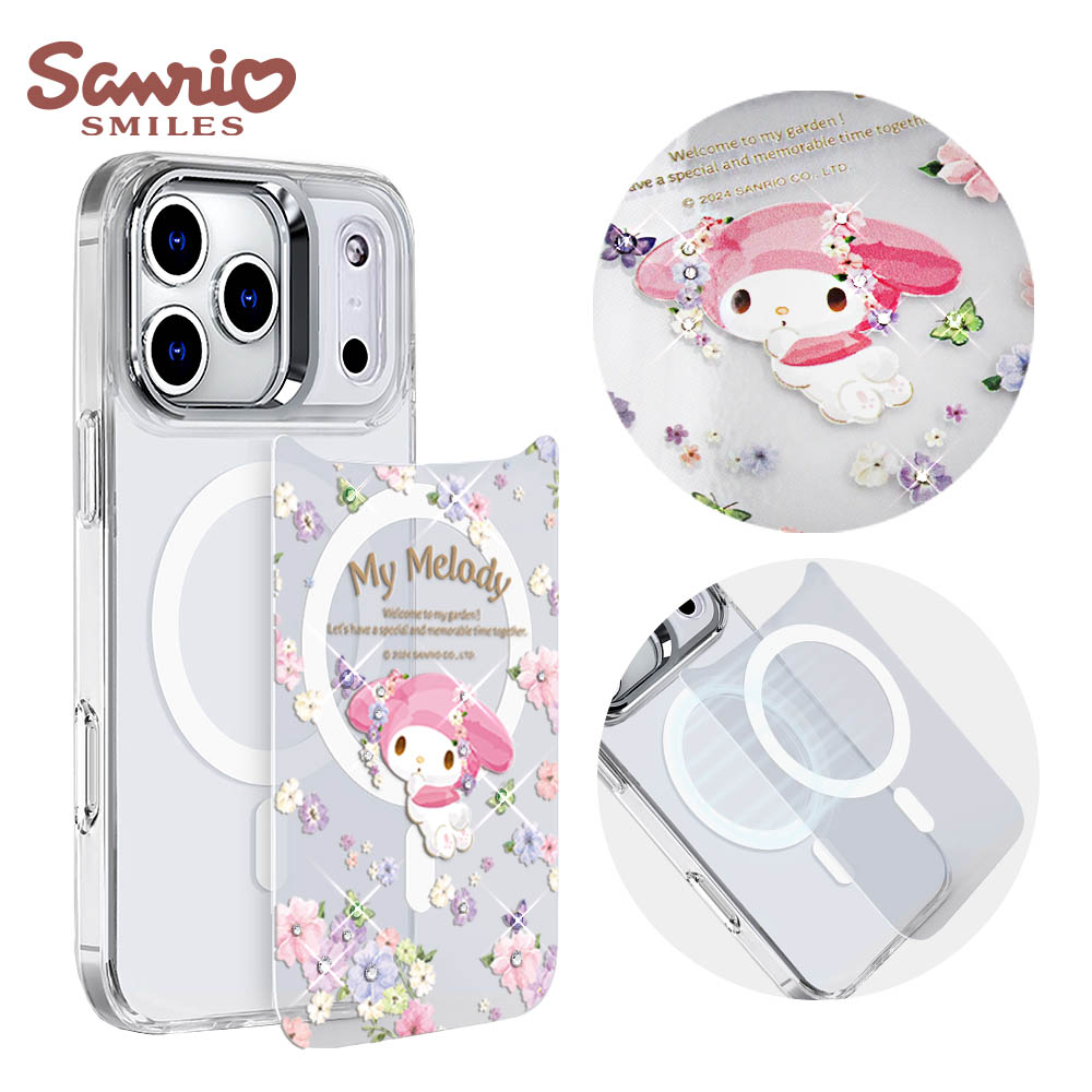 三麗鷗 抗黃化磁吸金屬框隱形立架殼-花語美樂蒂-電鍍銀(iPhone 16/15/14/13系列)