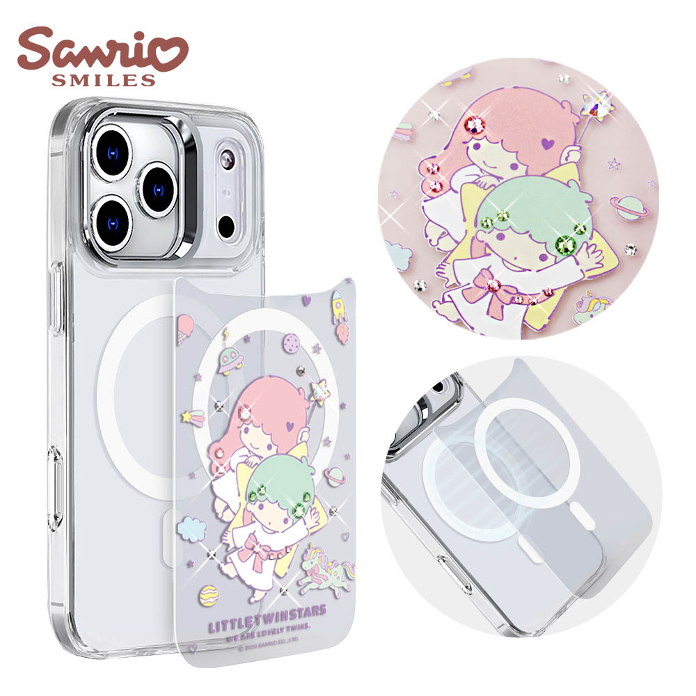 三麗鷗 軍規防摔合金框隱形立架鏡面彩鑽手機殼-星月雙子星-黑框(iPhone 17/16/15/14/13系列)